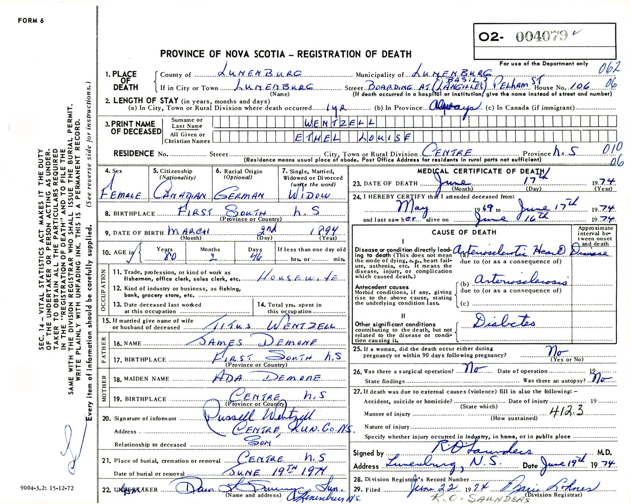 Female Death Registration: Year: 1974 number: 4079