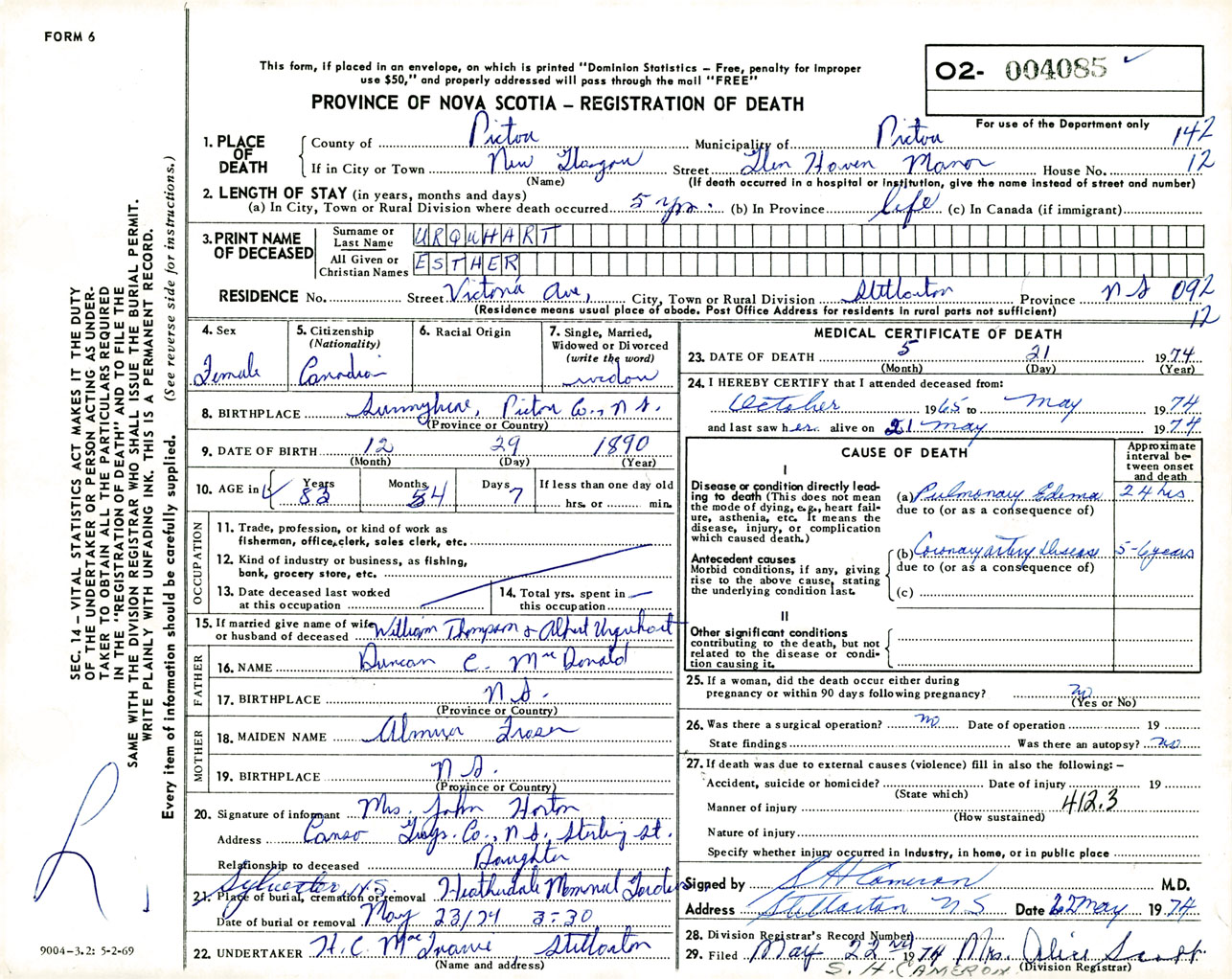 Female Death Registration: Year: 1974 number: 4085