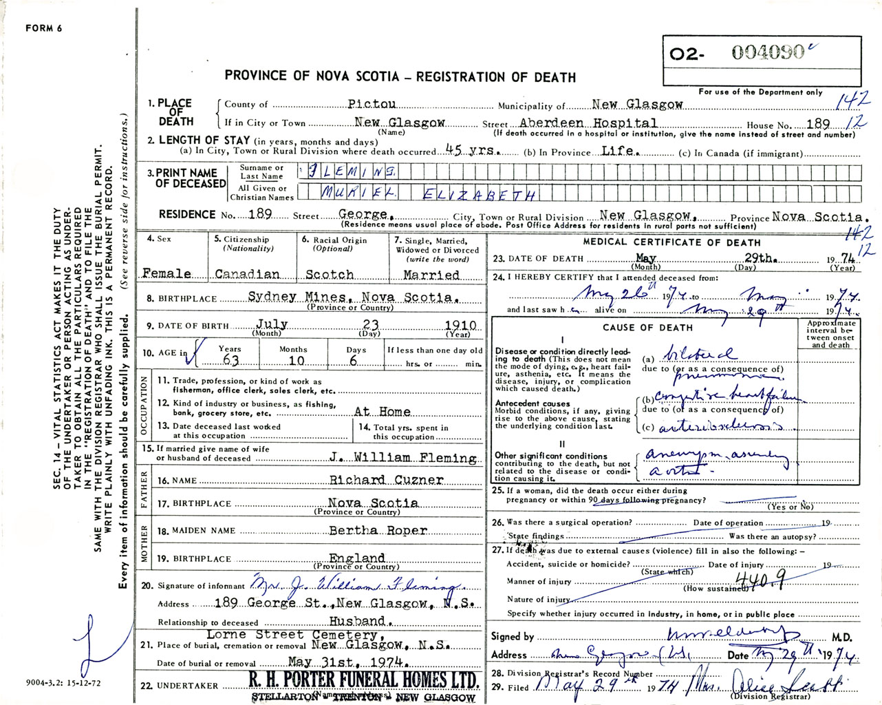 Female Death Registration: Year: 1974 number: 4090