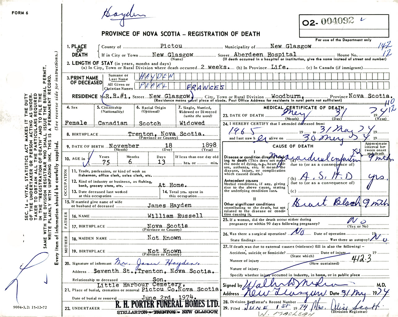 Female Death Registration: Year: 1974 number: 4092