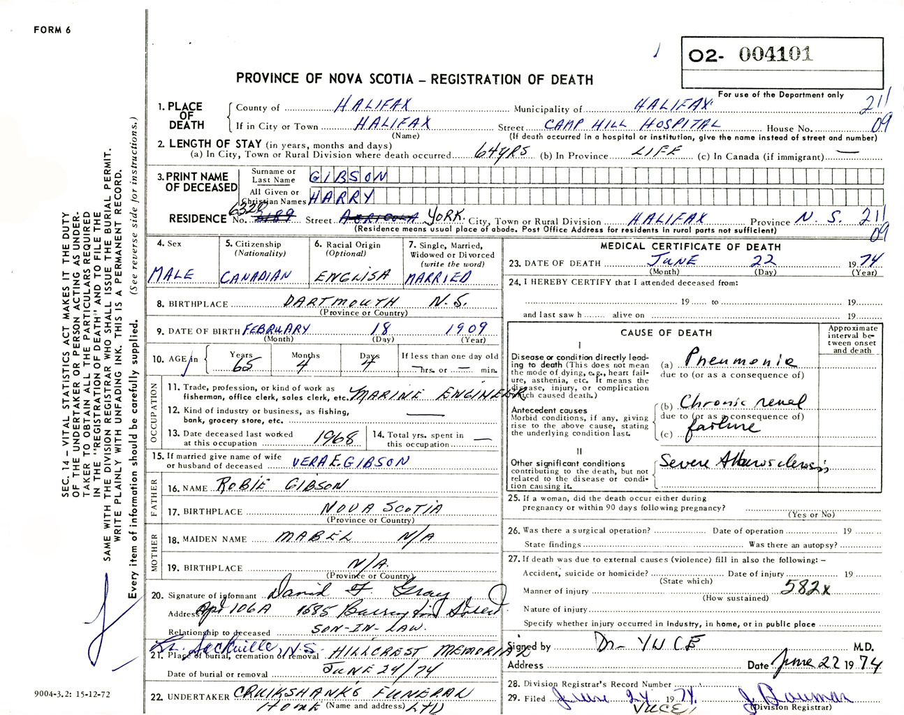 Male Death Registration: Year: 1974 number: 4101