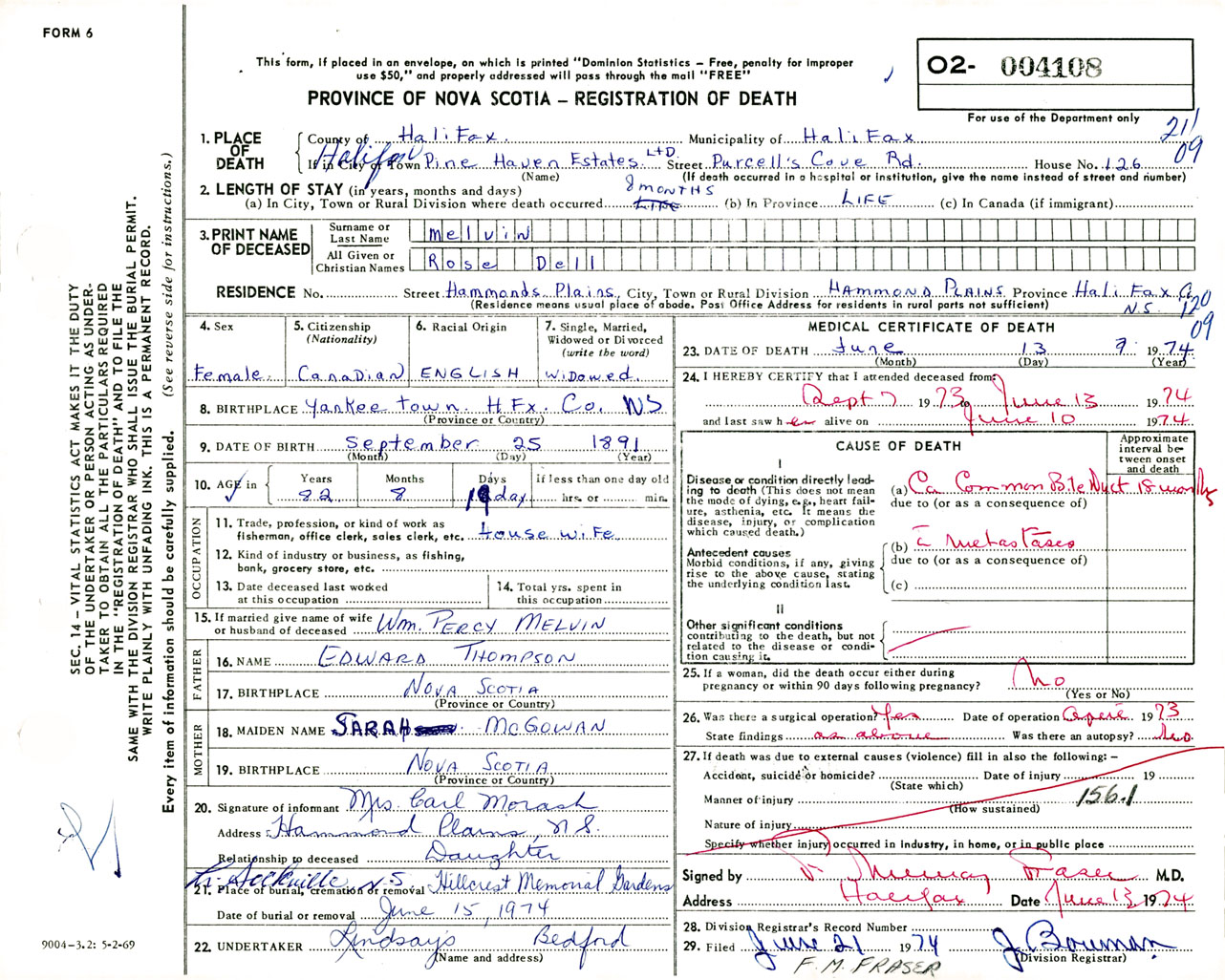 Female Death Registration: Year: 1974 number: 4108