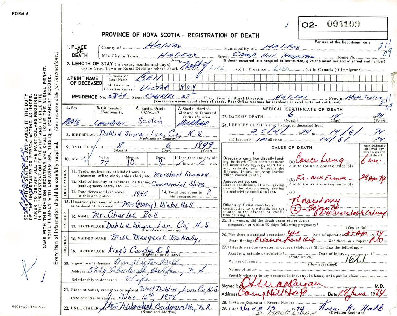 Male Death Registration: Year: 1974 number: 4109