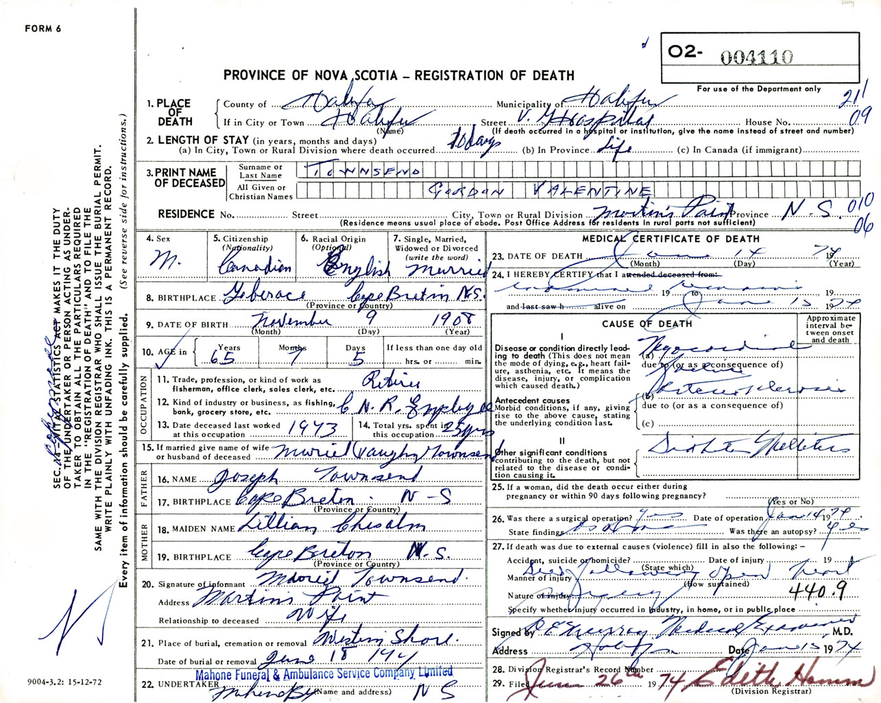 Male Death Registration: Year: 1974 number: 4110
