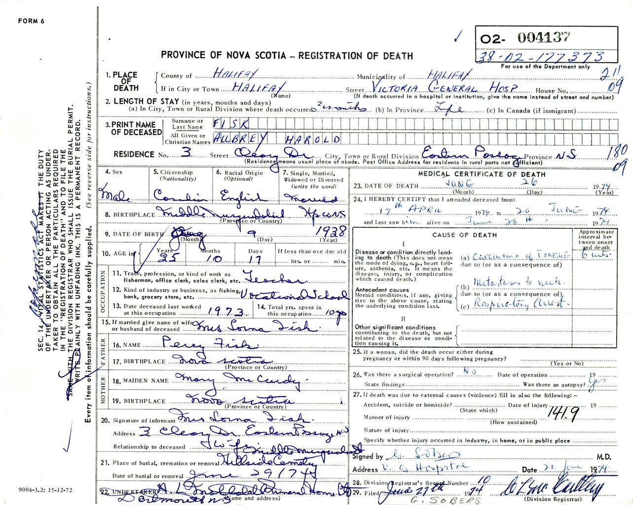 Male Death Registration: Year: 1974 number: 4137