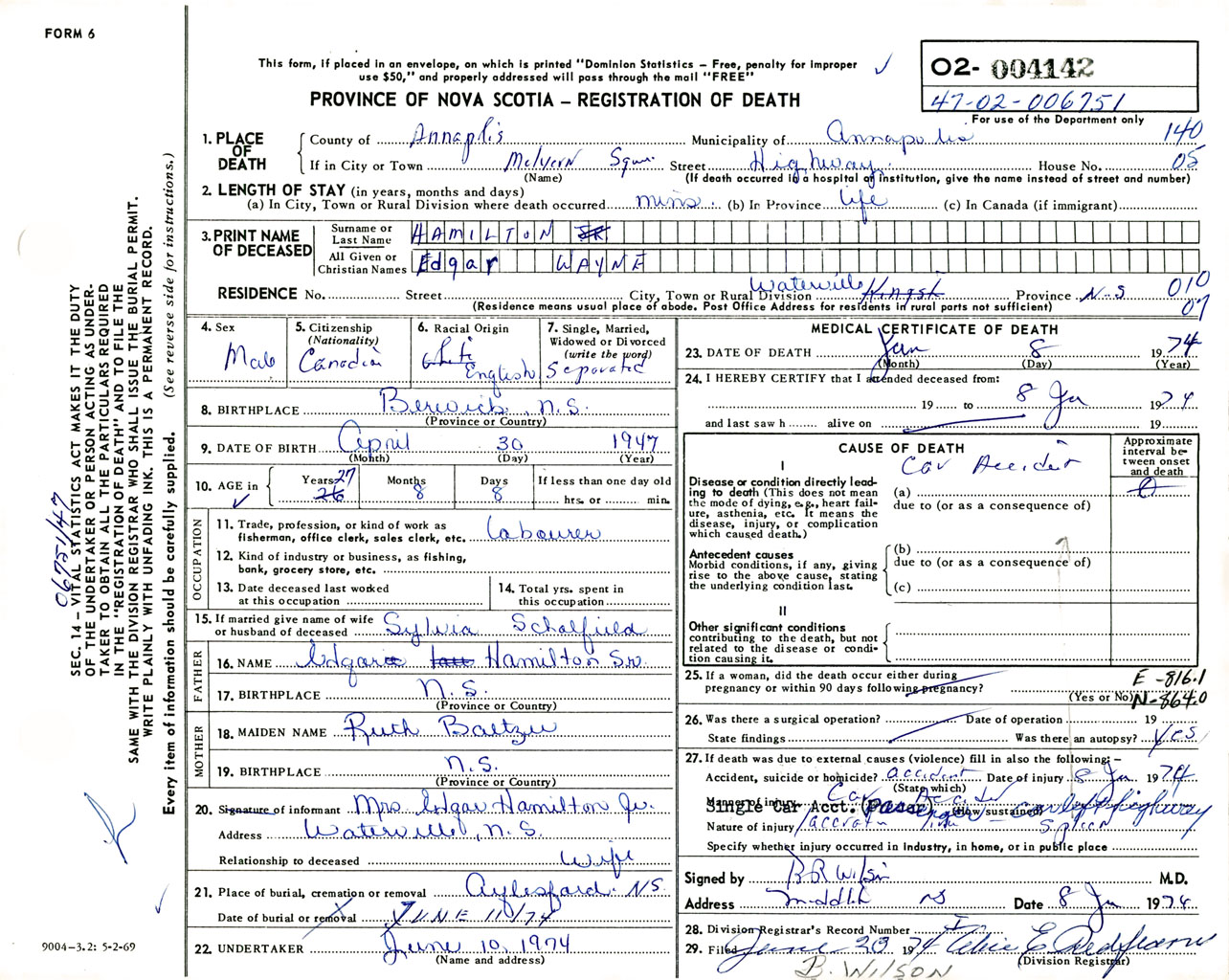 Male Death Registration: Year: 1974 number: 4142