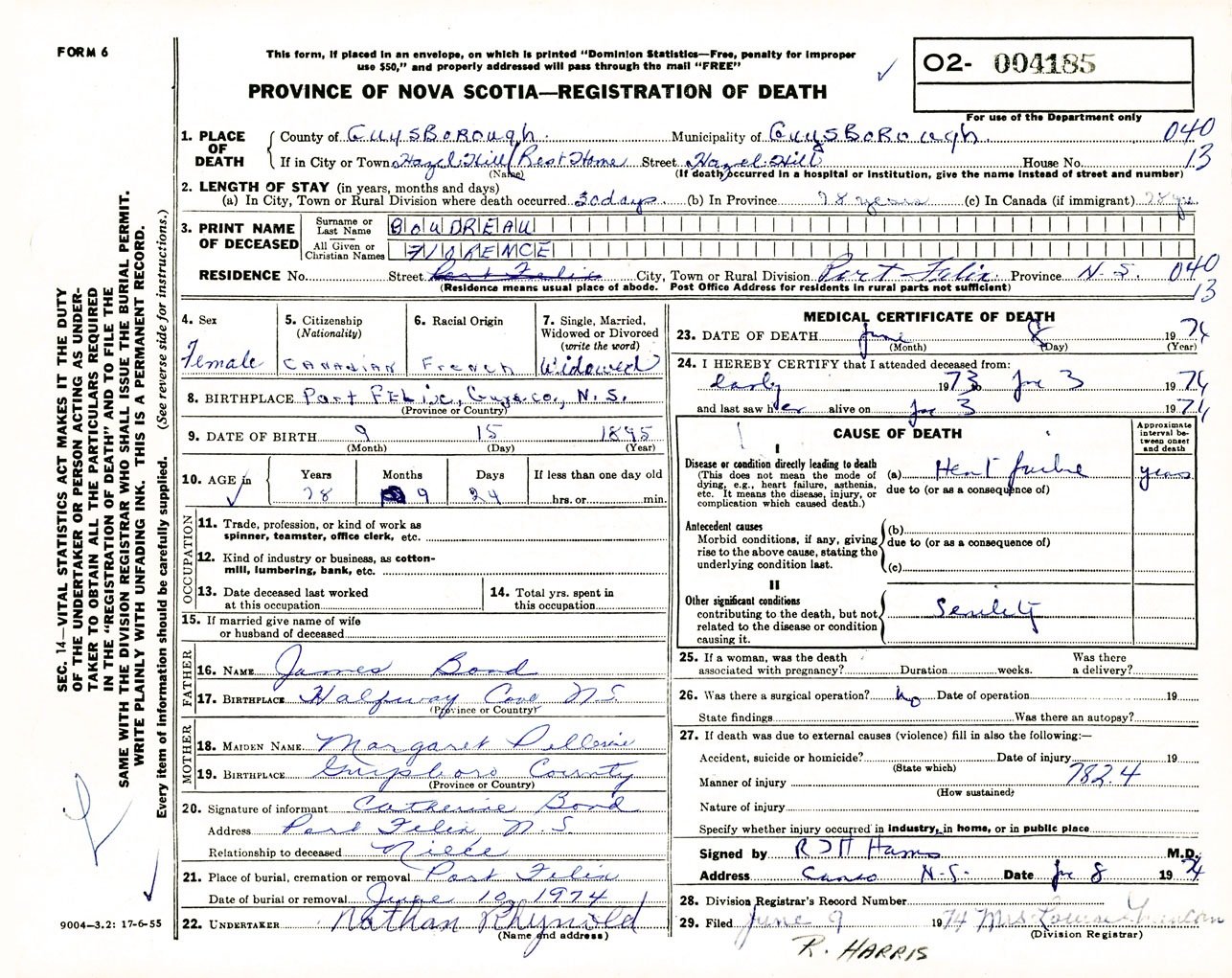 Female Death Registration: Year: 1974 number: 4185