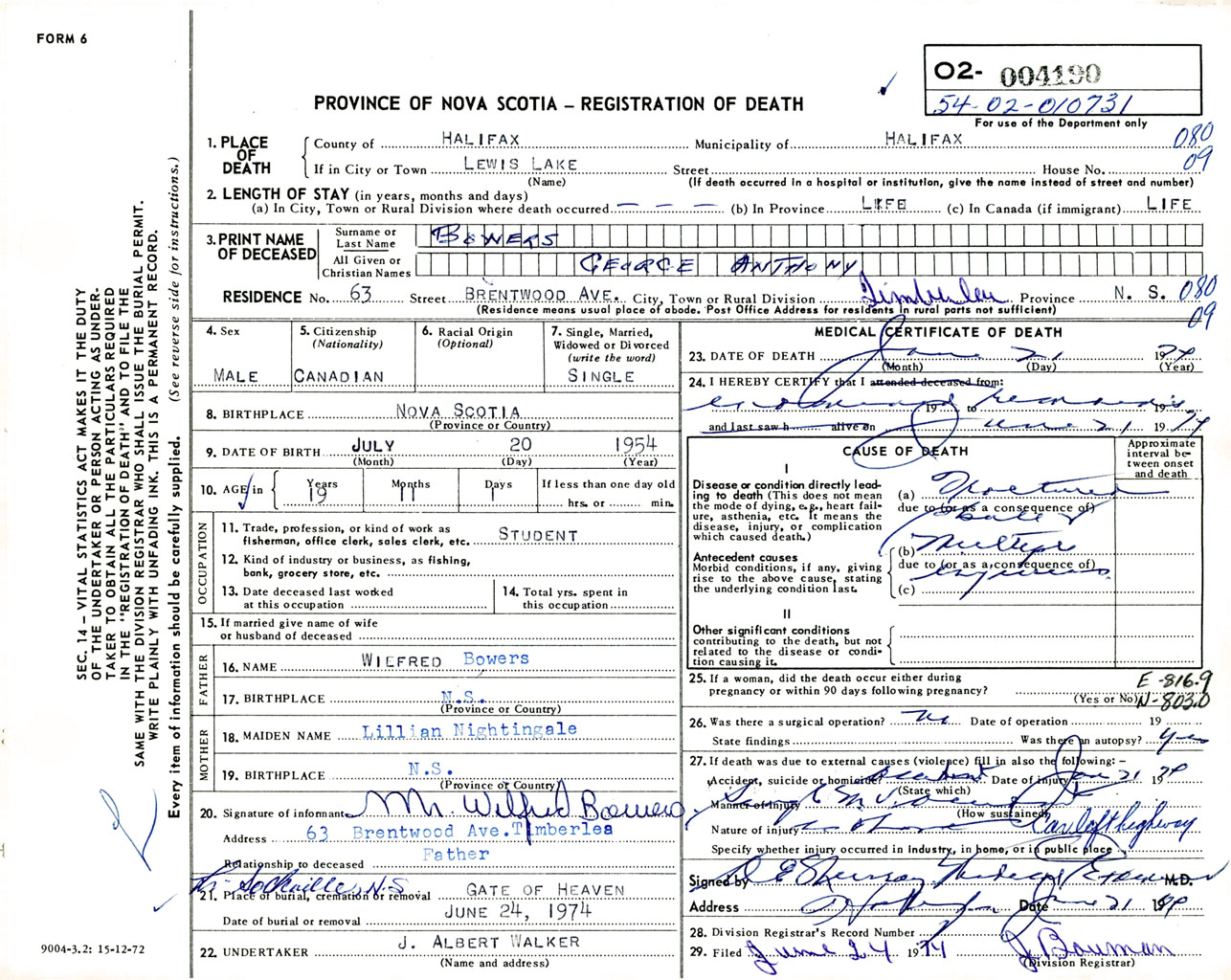 Male Death Registration: Year: 1974 number: 4190