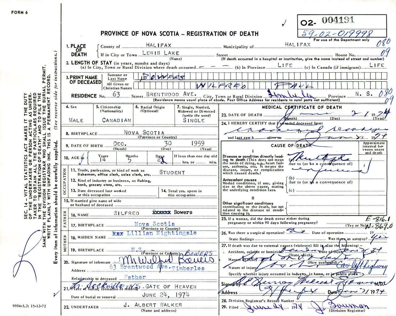Male Death Registration: Year: 1974 number: 4191