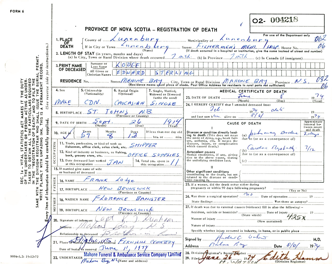 Male Death Registration: Year: 1974 number: 4218