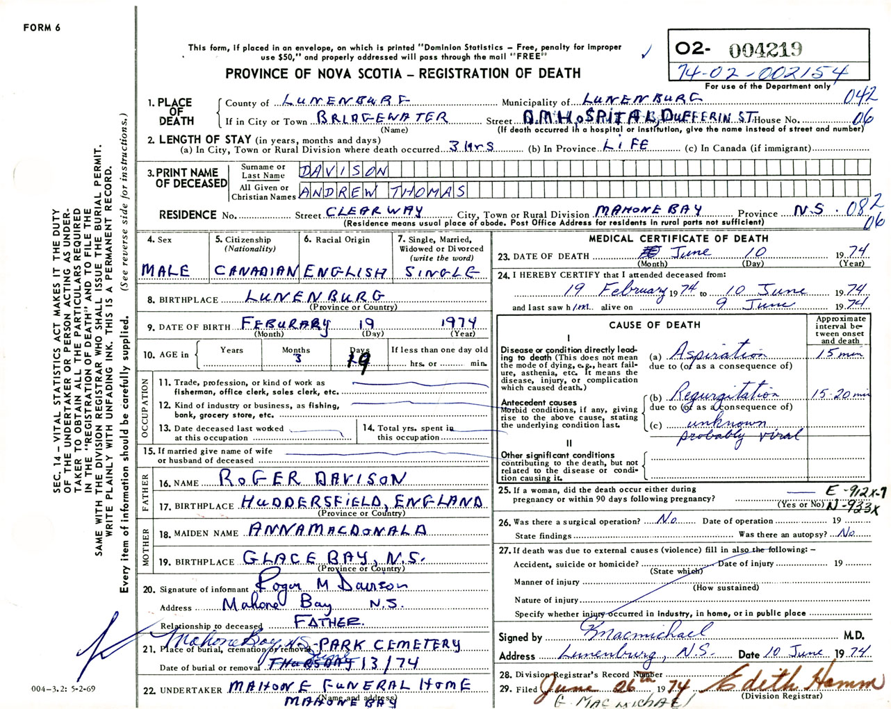 Male Death Registration: Year: 1974 number: 4219