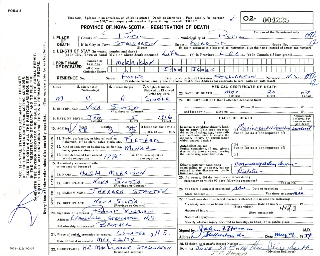 Male Death Registration: Year: 1974 number: 4225