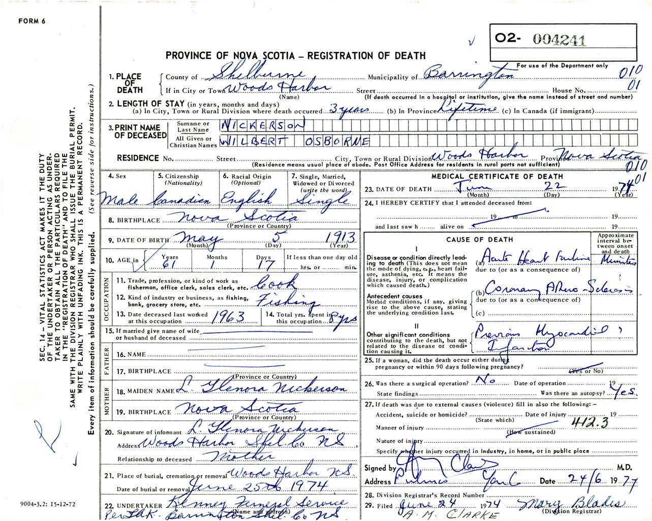 Male Death Registration: Year: 1974 number: 4241