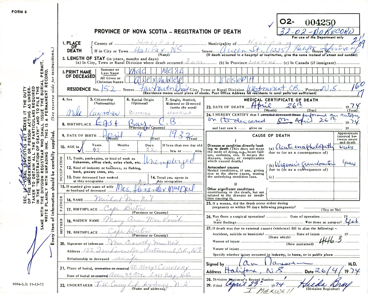 Male Death Registration: Year: 1974 number: 4250