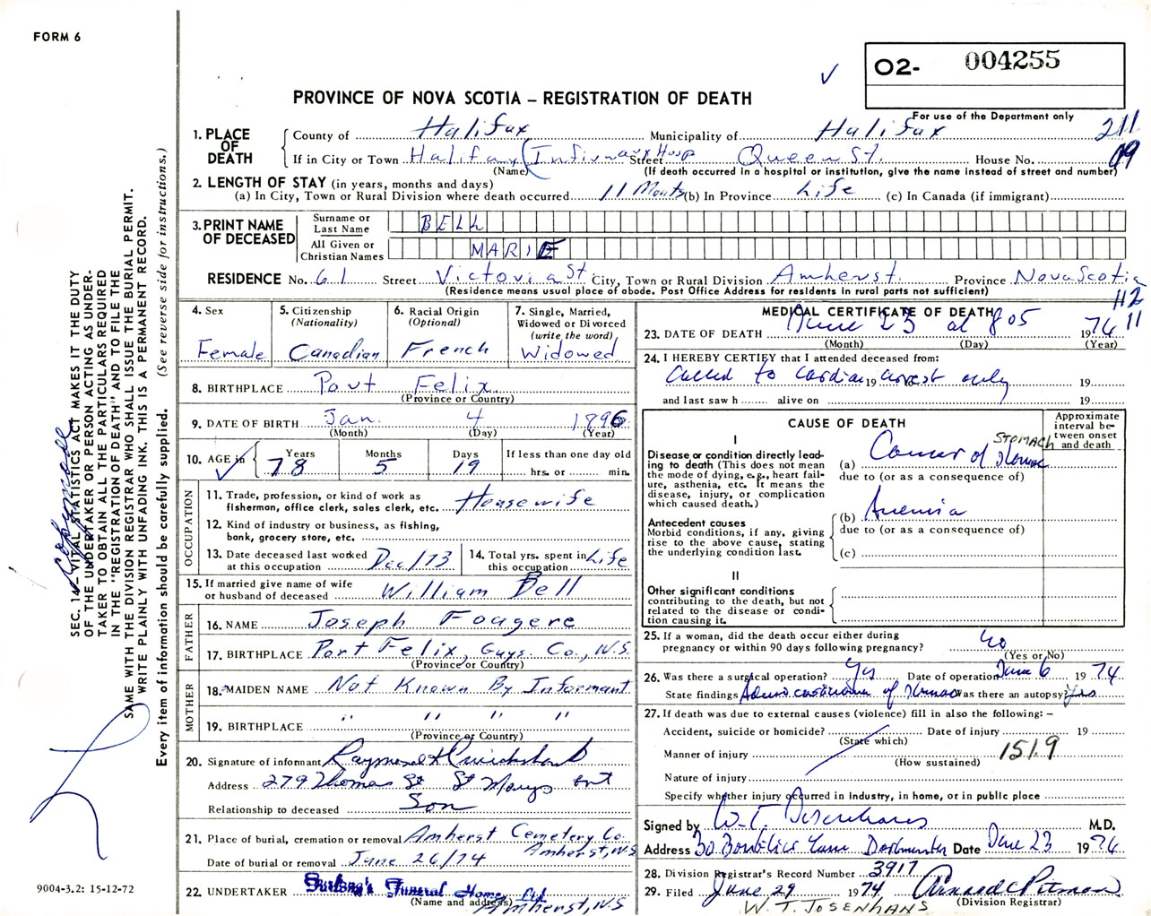 Female Death Registration: Year: 1974 number: 4255