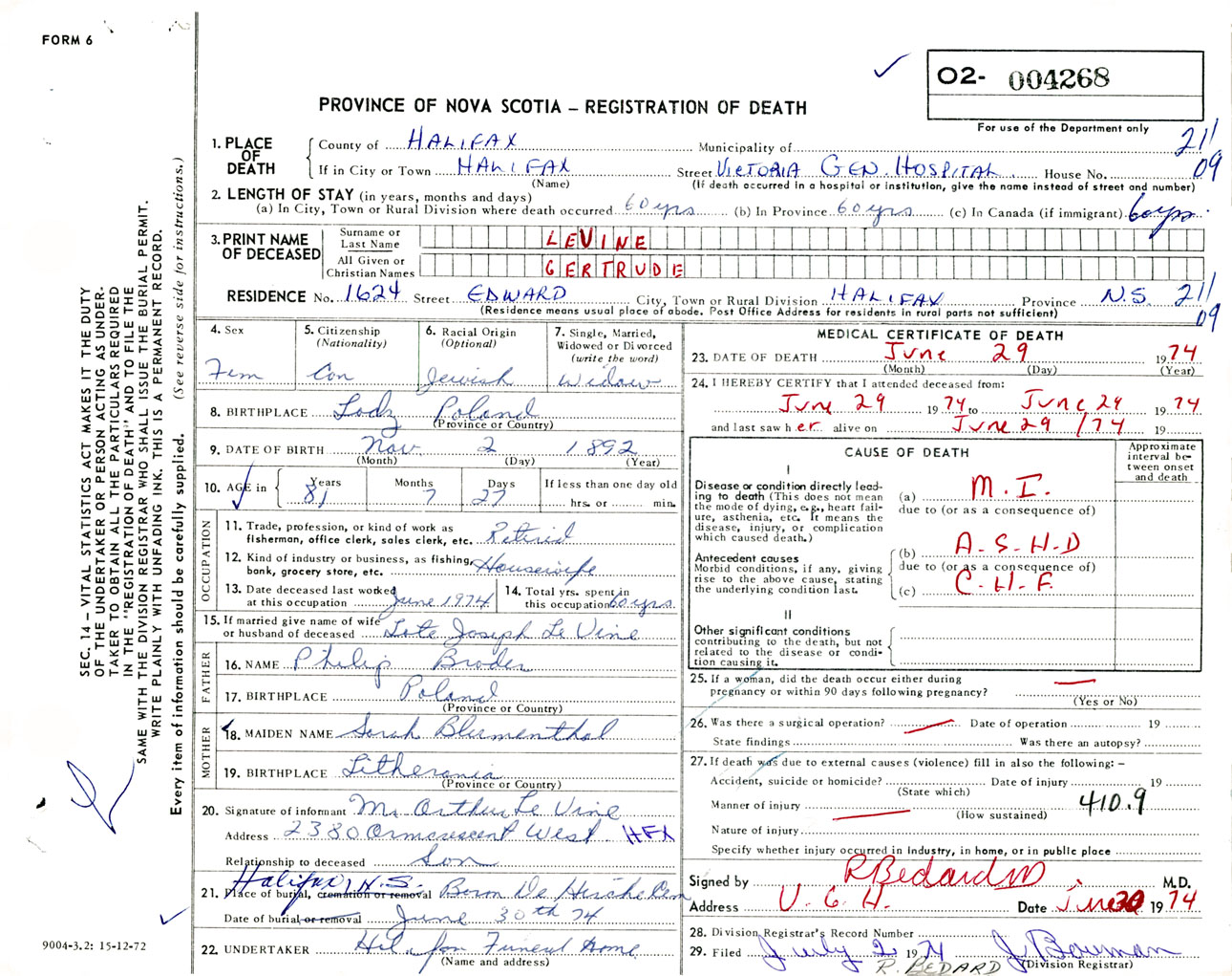 Female Death Registration: Year: 1974 number: 4268
