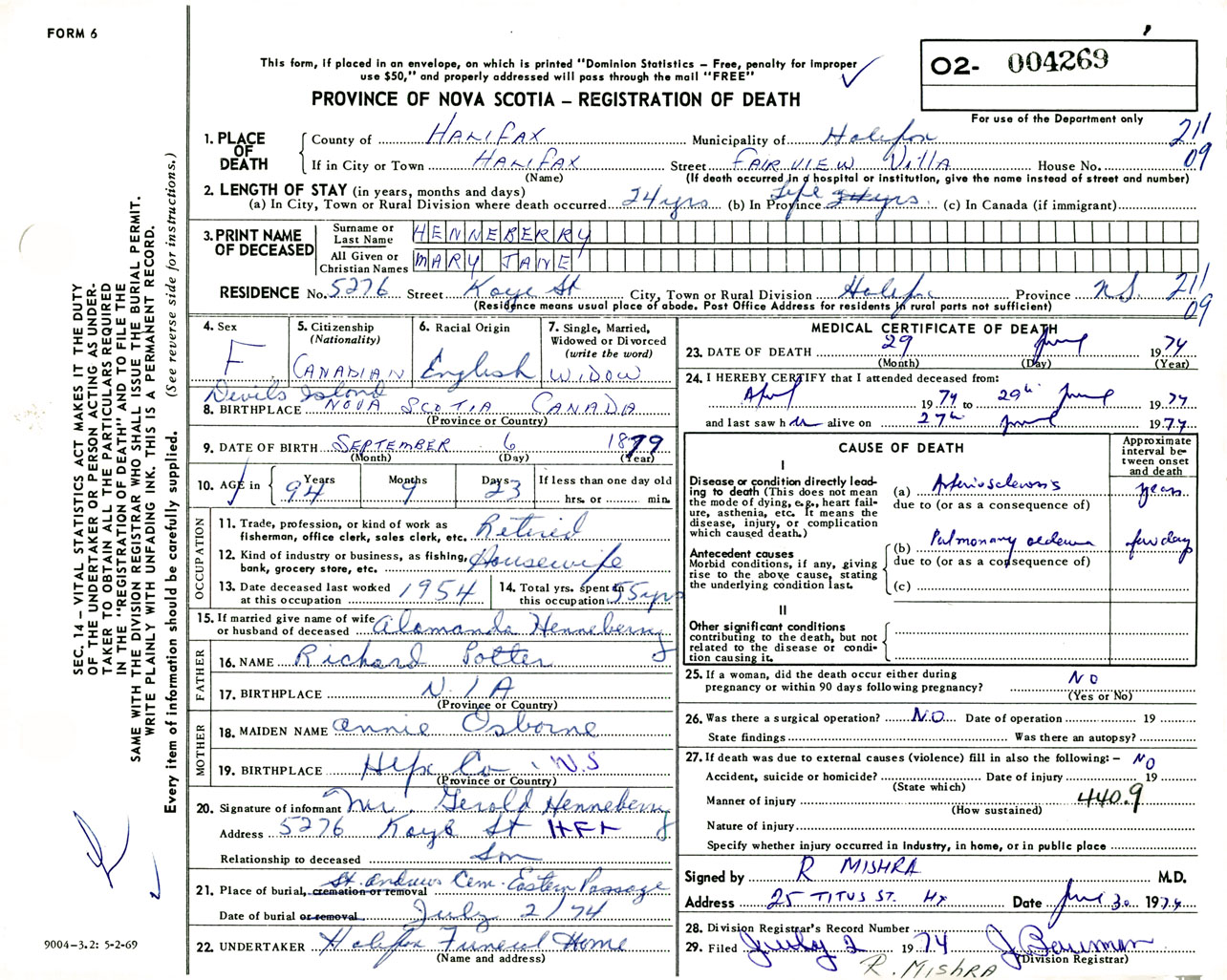 Female Death Registration: Year: 1974 number: 4269