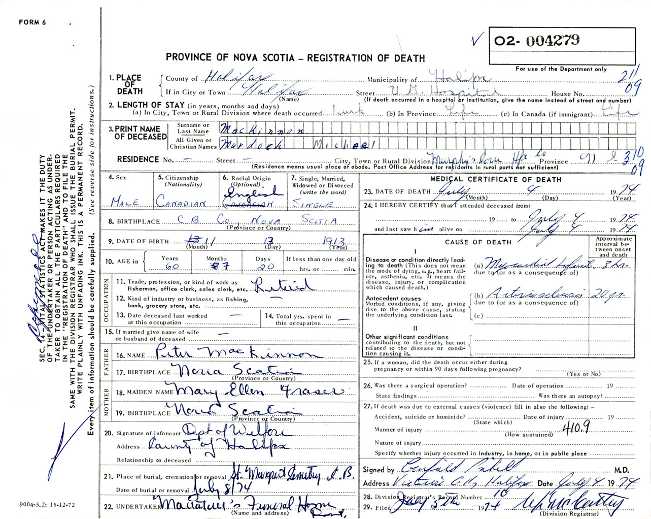 Male Death Registration: Year: 1974 number: 4279