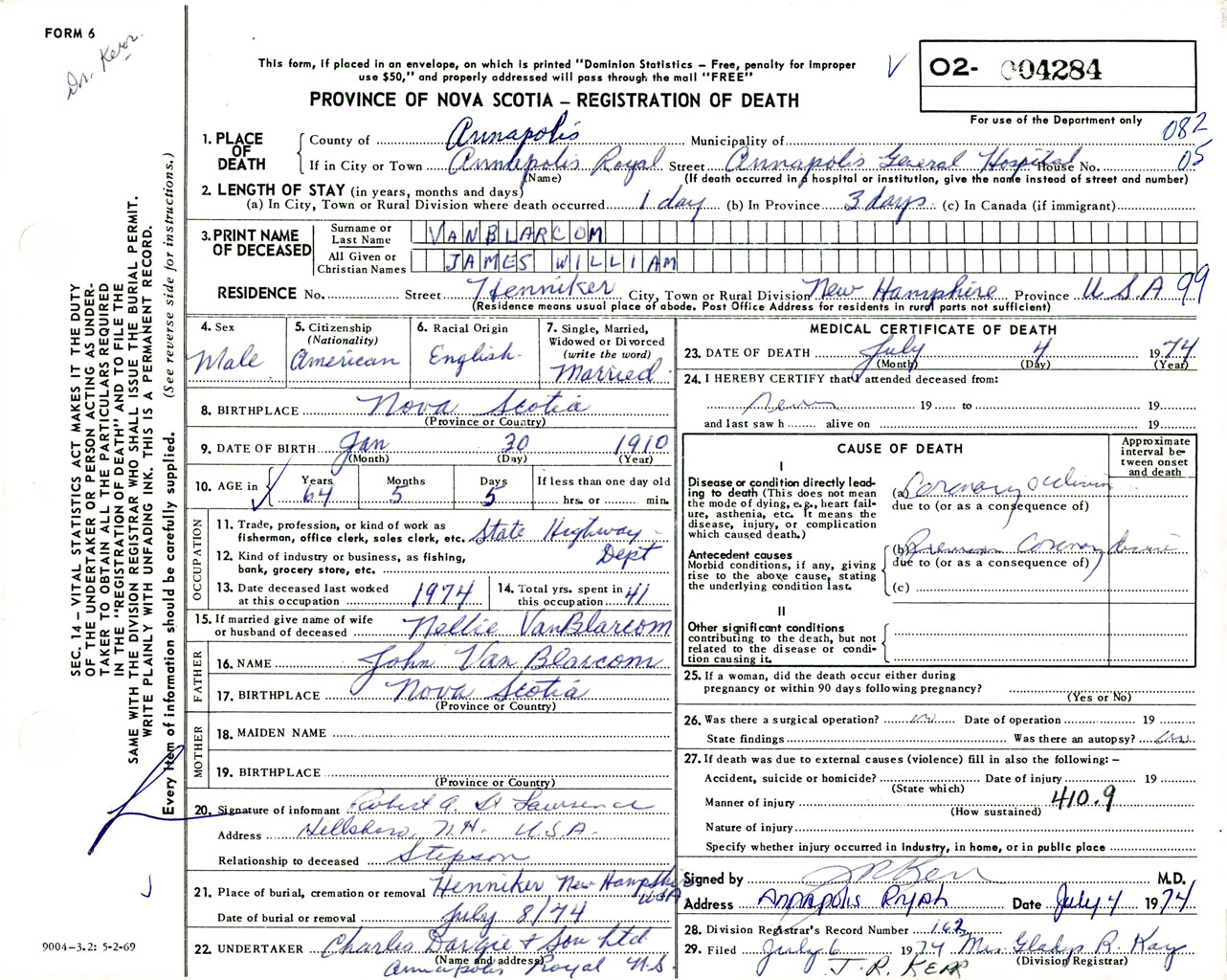 Male Death Registration: Year: 1974 number: 4284