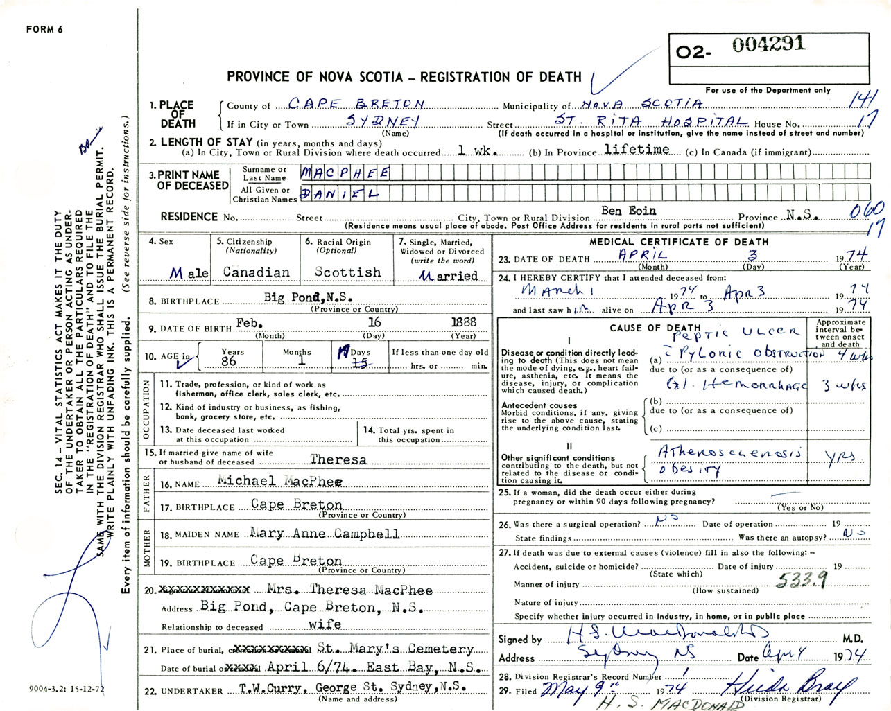 Male Death Registration: Year: 1974 number: 4291