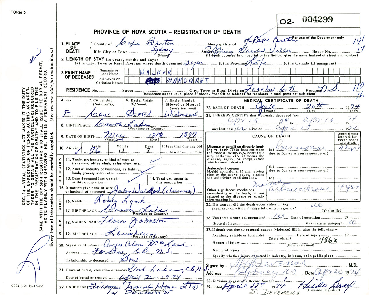 Female Death Registration: Year: 1974 number: 4299