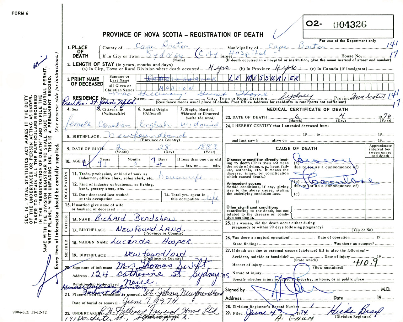 Female Death Registration: Year: 1974 number: 4326