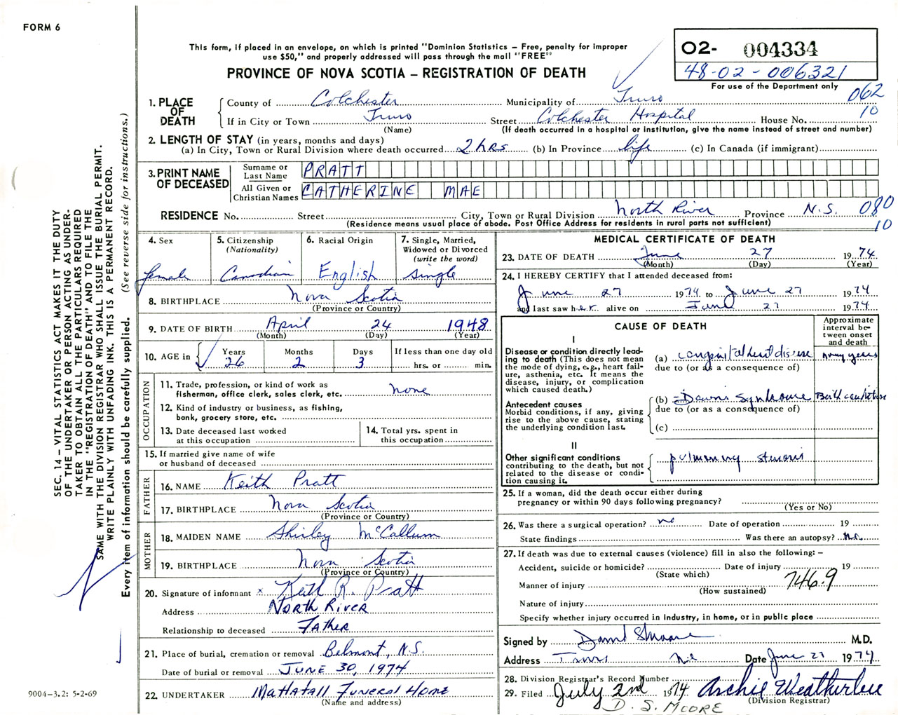 Female Death Registration: Year: 1974 number: 4334