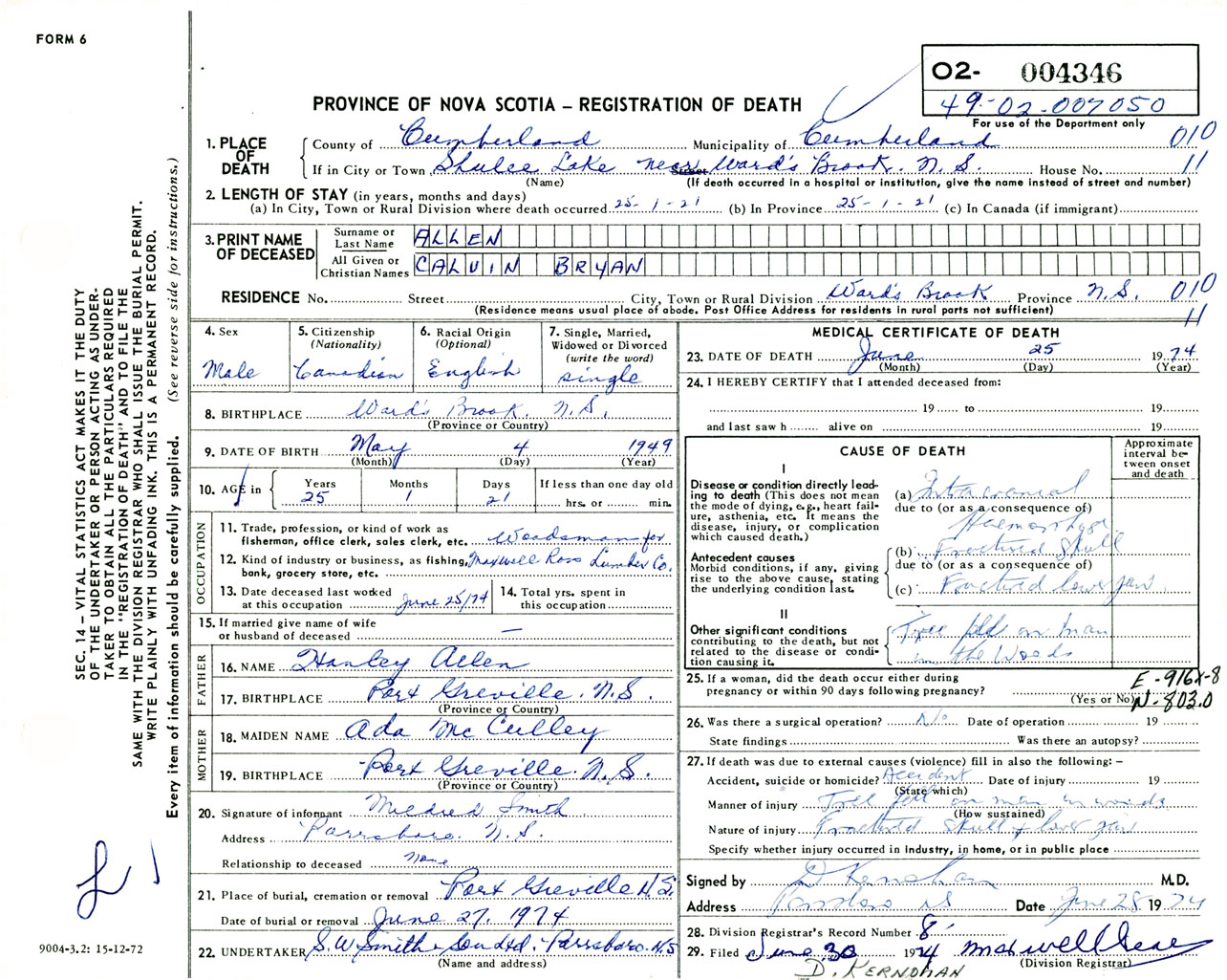 Male Death Registration: Year: 1974 number: 4346