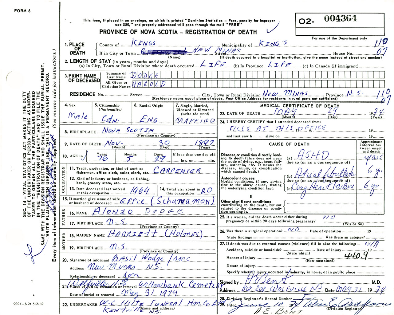 Male Death Registration: Year: 1974 number: 4364