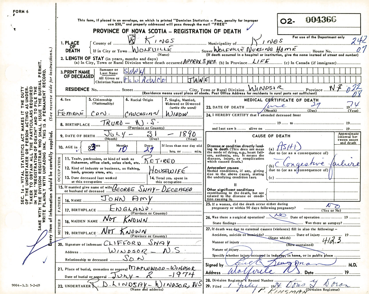 Female Death Registration: Year: 1974 number: 4366