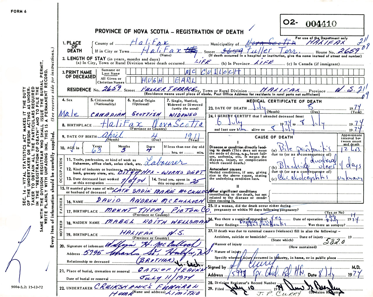Male Death Registration: Year: 1974 number: 4410