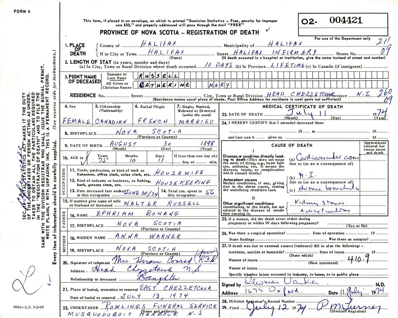 Female Death Registration: Year: 1974 number: 4421