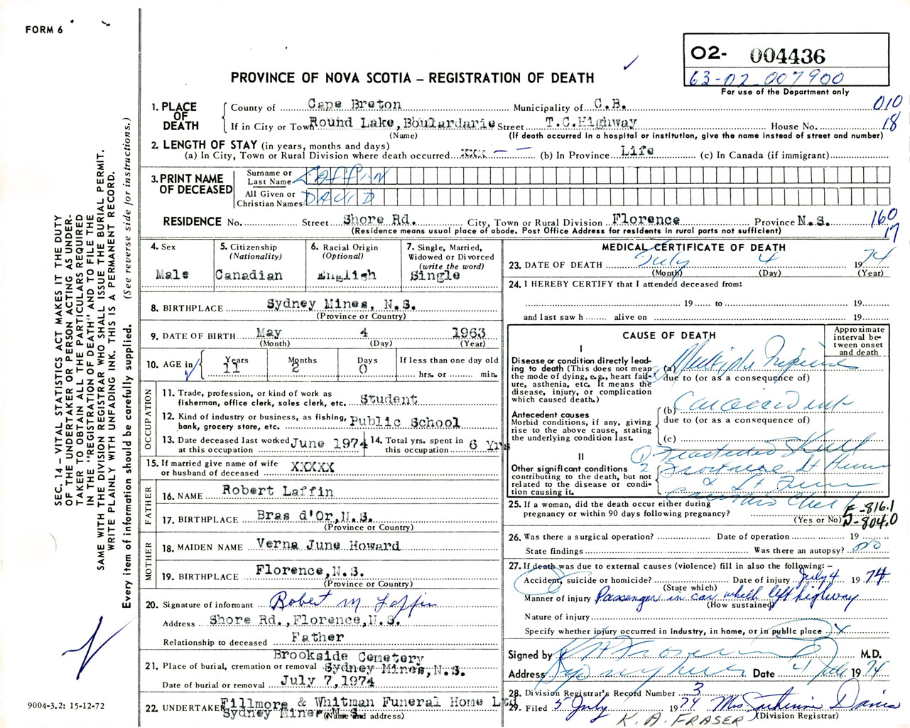 Male Death Registration: Year: 1974 number: 4436