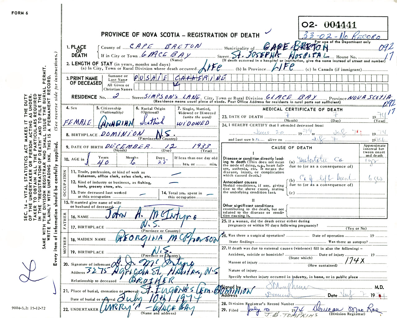 Female Death Registration: Year: 1974 number: 4441