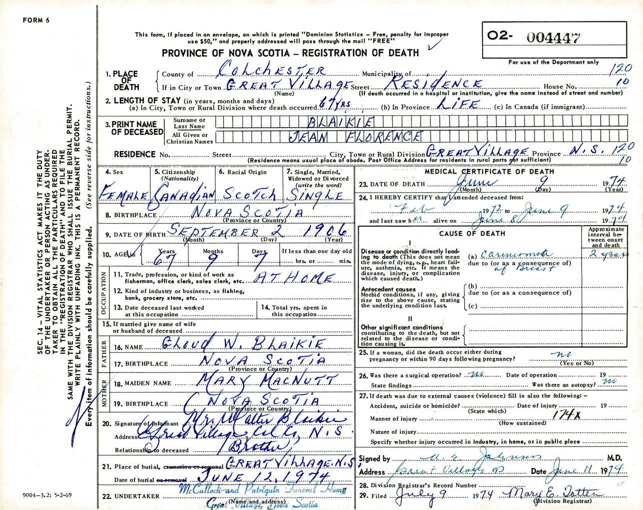 Female Death Registration: Year: 1974 number: 4447