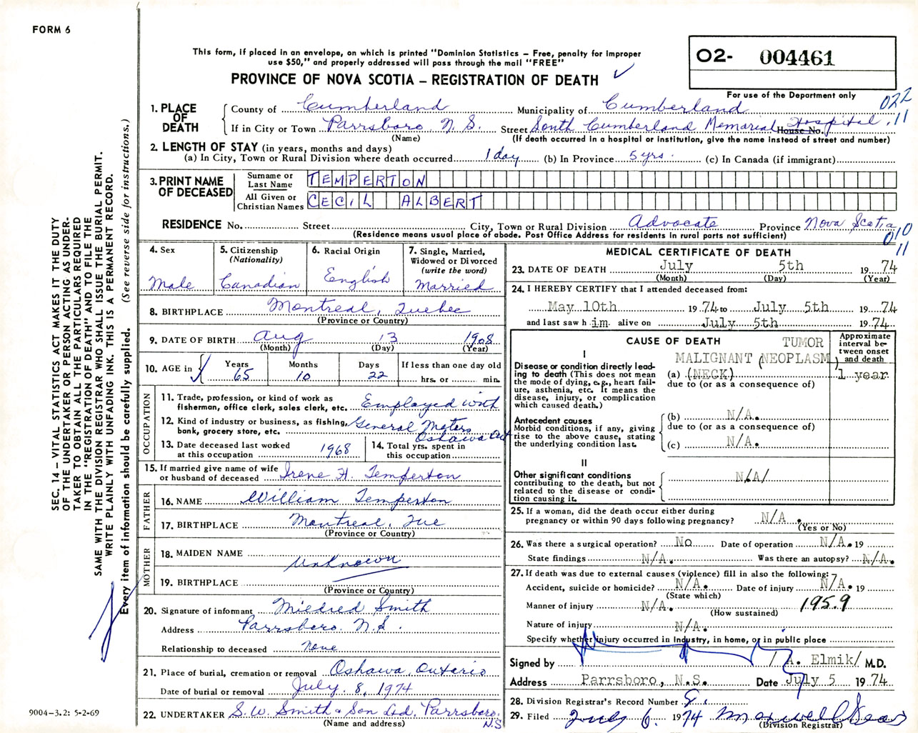 Male Death Registration: Year: 1974 number: 4461