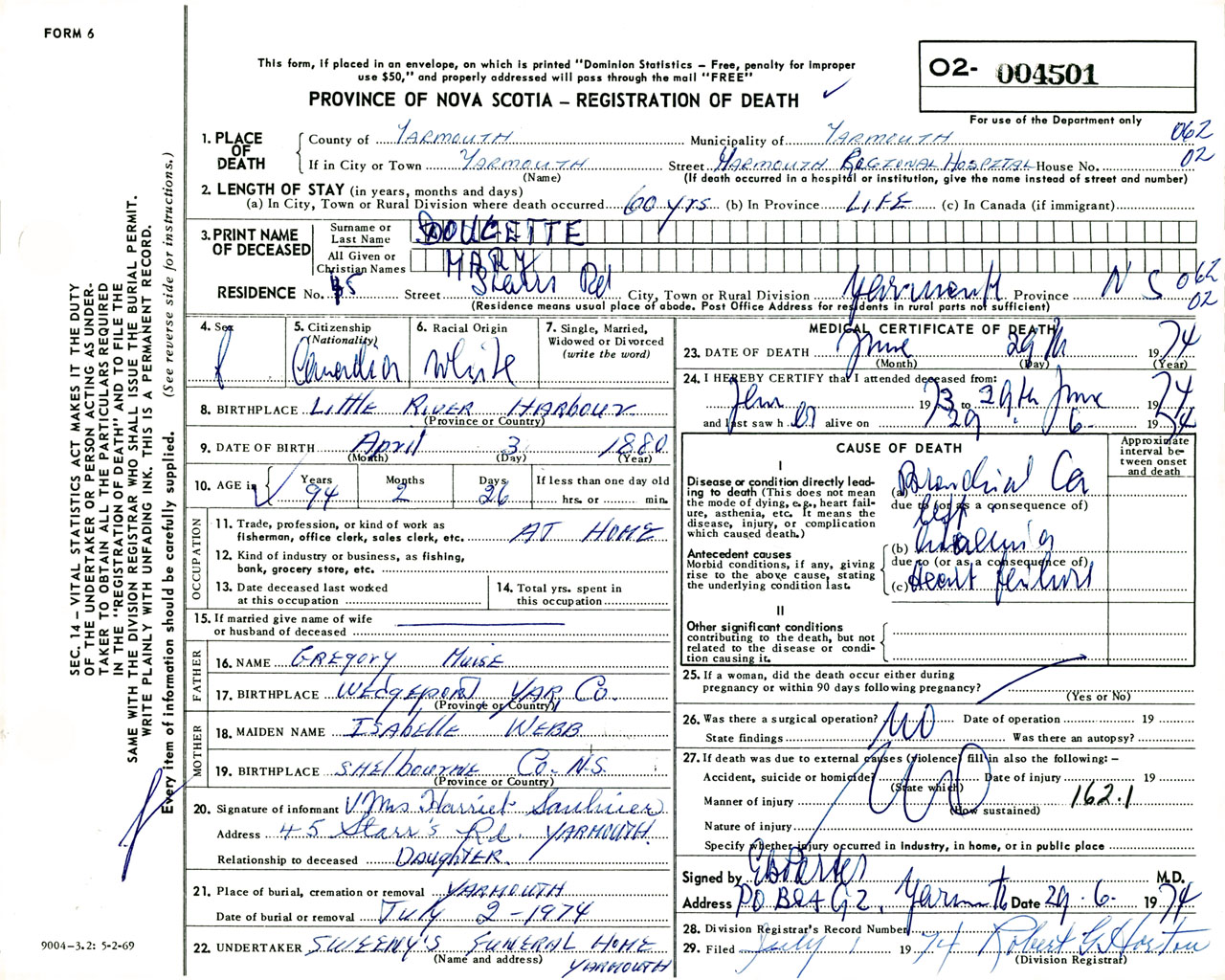 Female Death Registration: Year: 1974 number: 4501