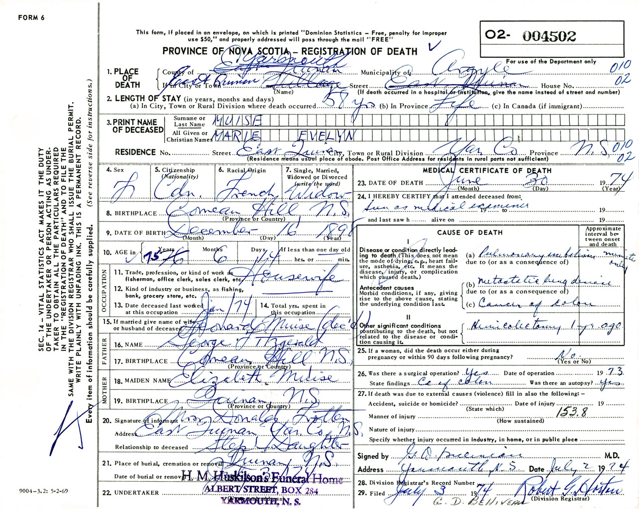 Female Death Registration: Year: 1974 number: 4502