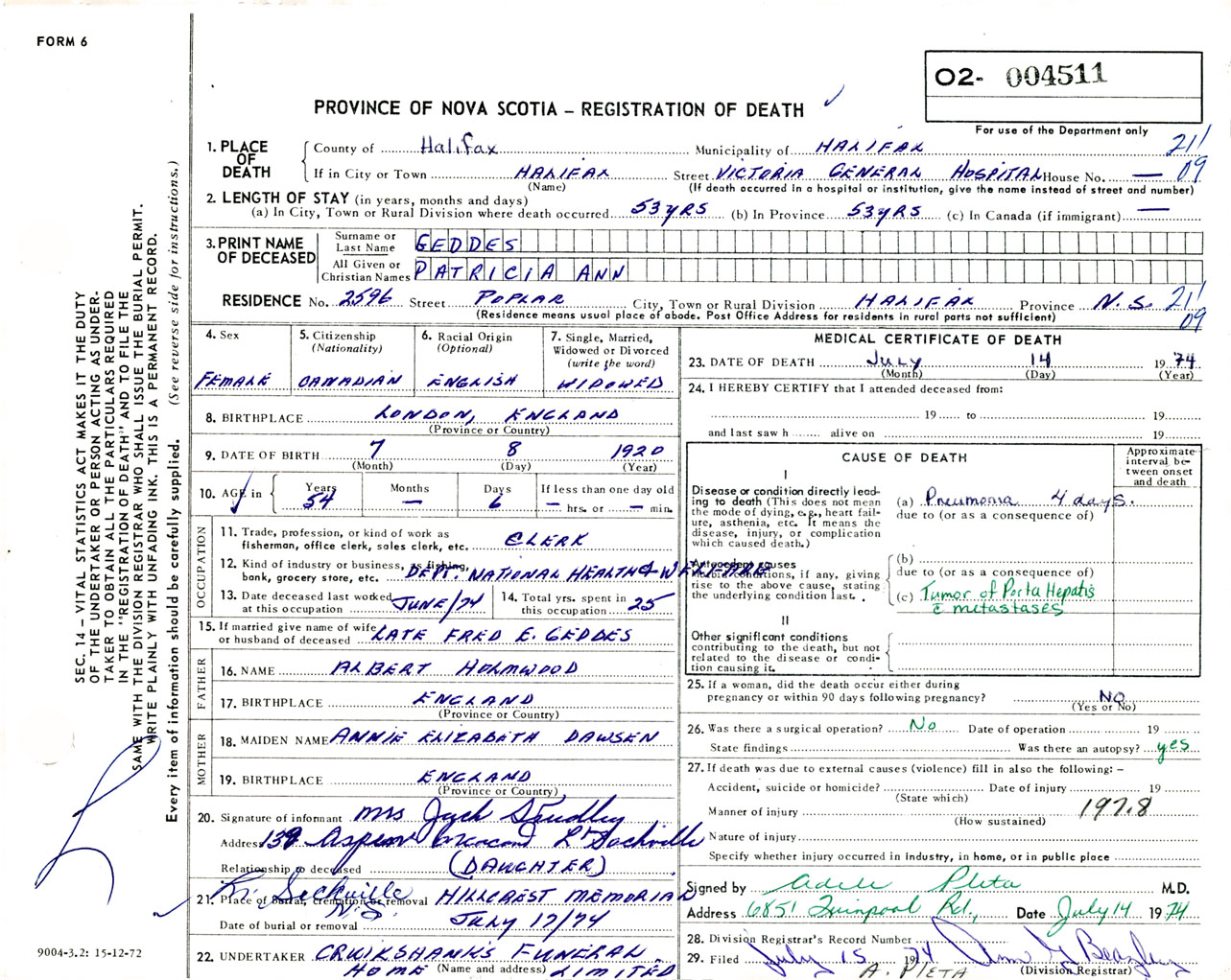 Female Death Registration: Year: 1974 number: 4511