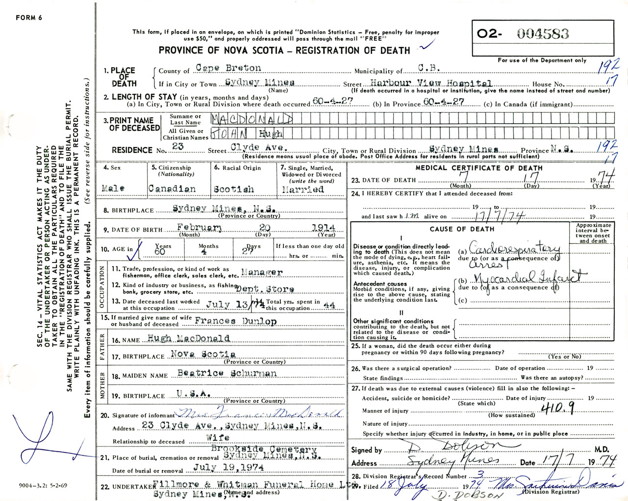 Male Death Registration: Year: 1974 number: 4583