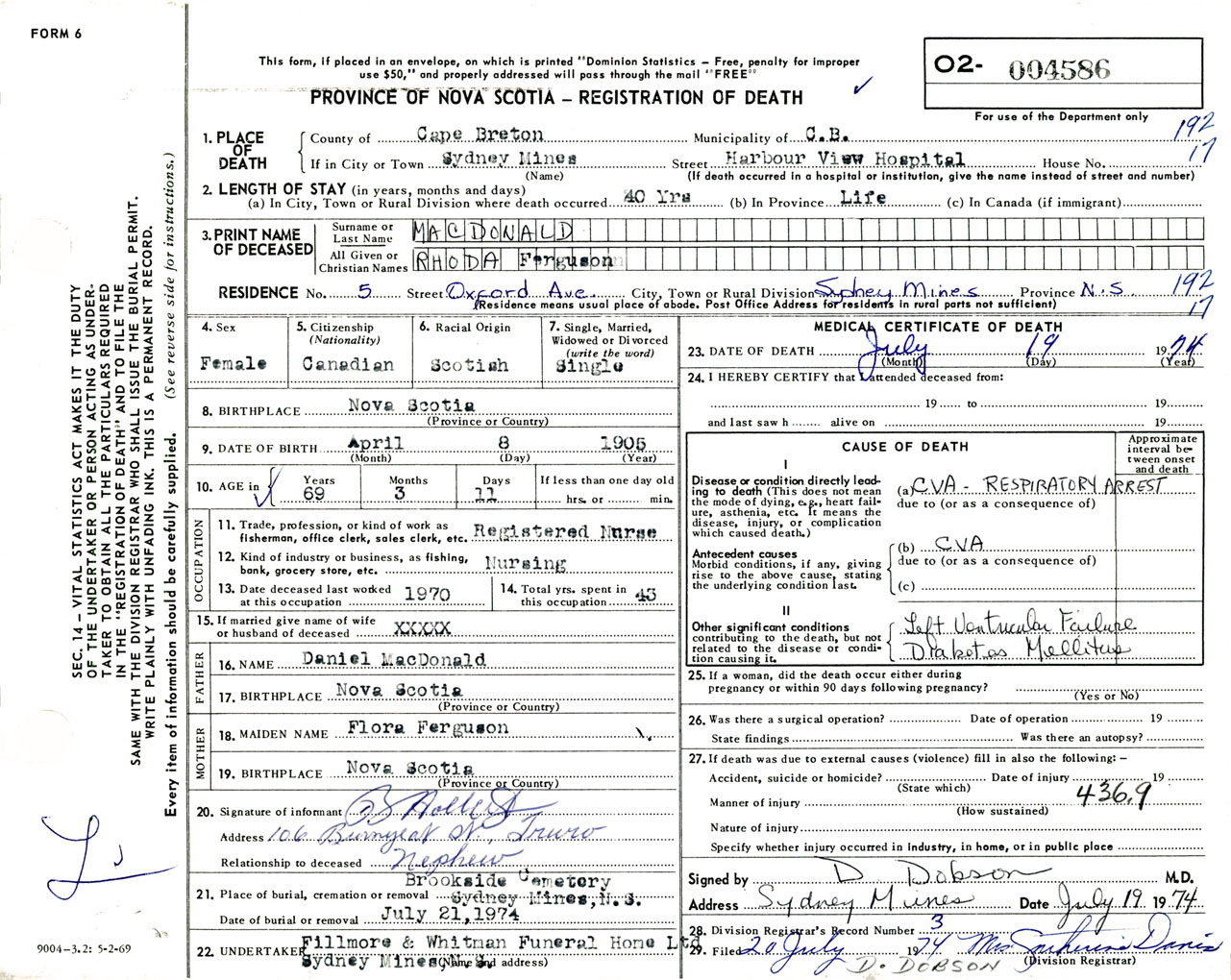Female Death Registration: Year: 1974 number: 4586