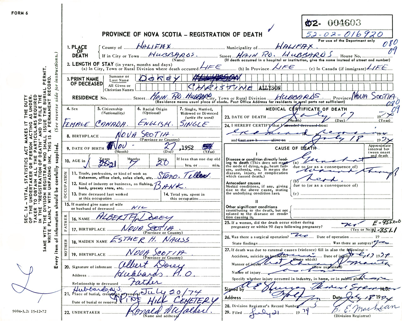 Female Death Registration: Year: 1974 number: 4603