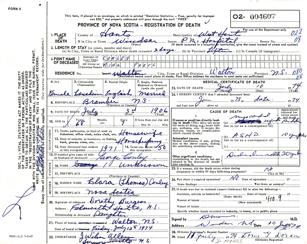Female Death Registration: Year: 1974 number: 4607