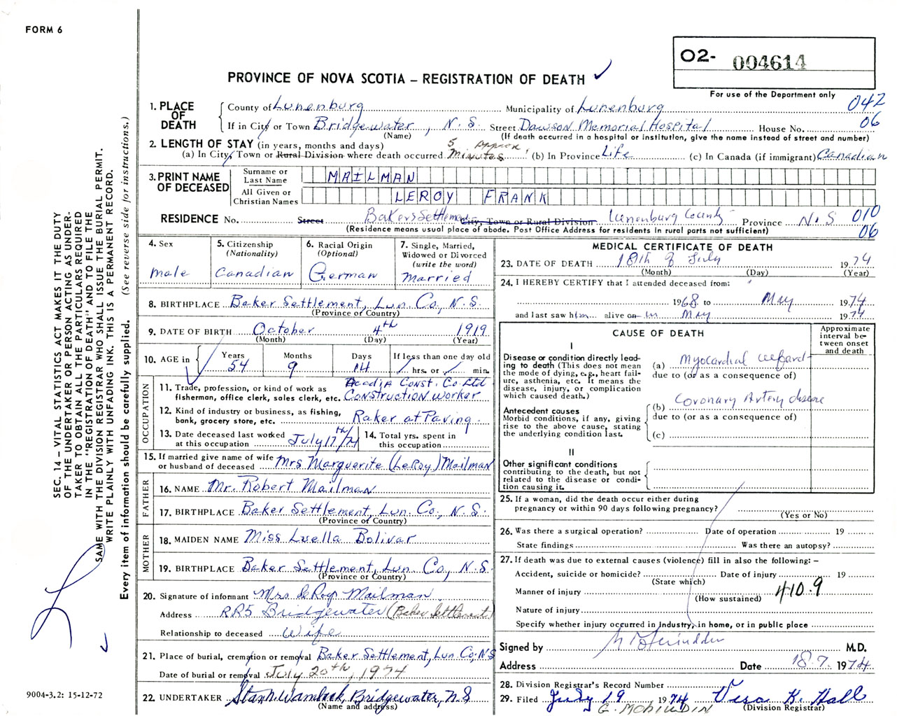 Male Death Registration: Year: 1974 number: 4614