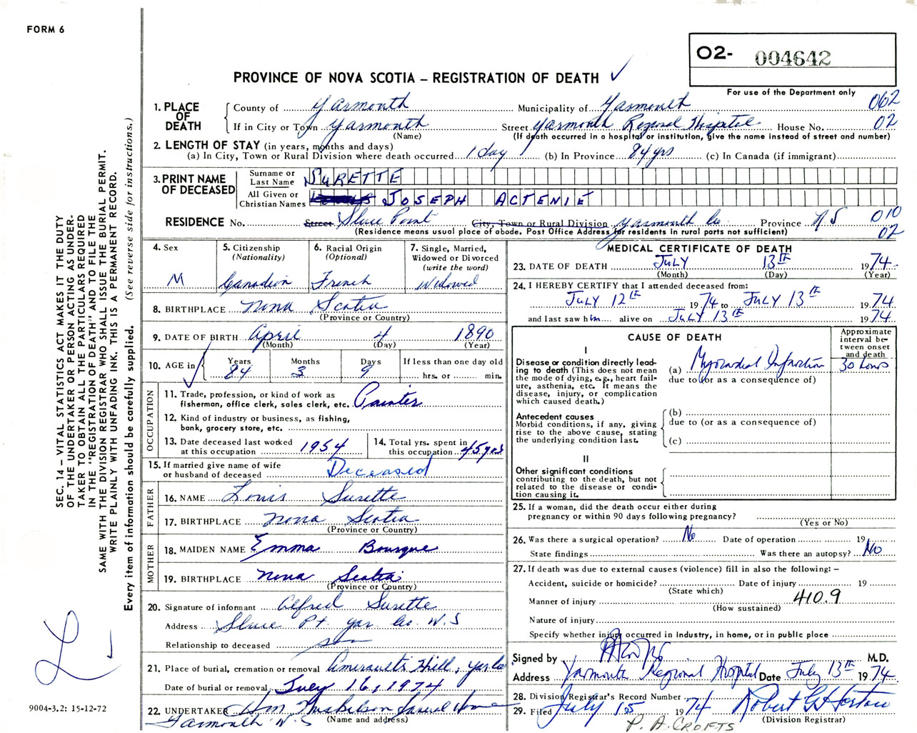 Male Death Registration: Year: 1974 number: 4642