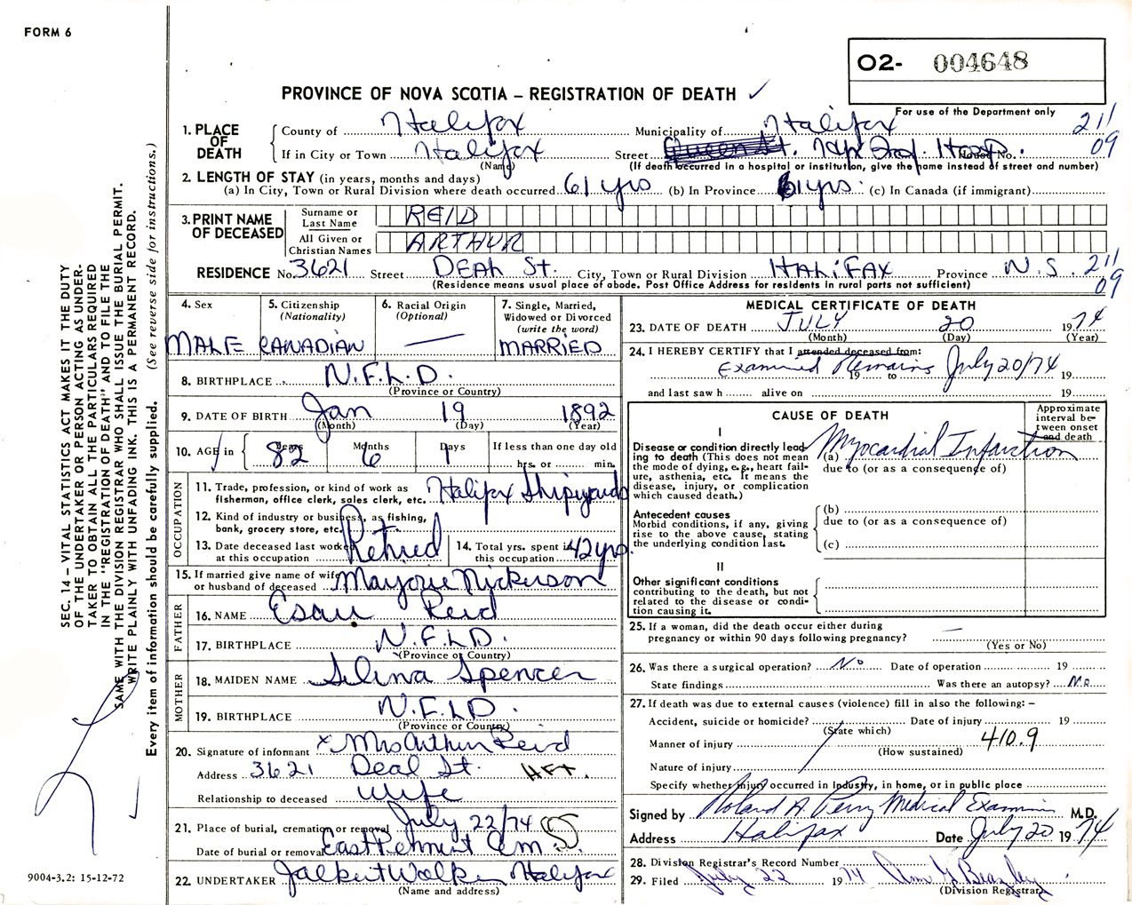 Male Death Registration: Year: 1974 number: 4648
