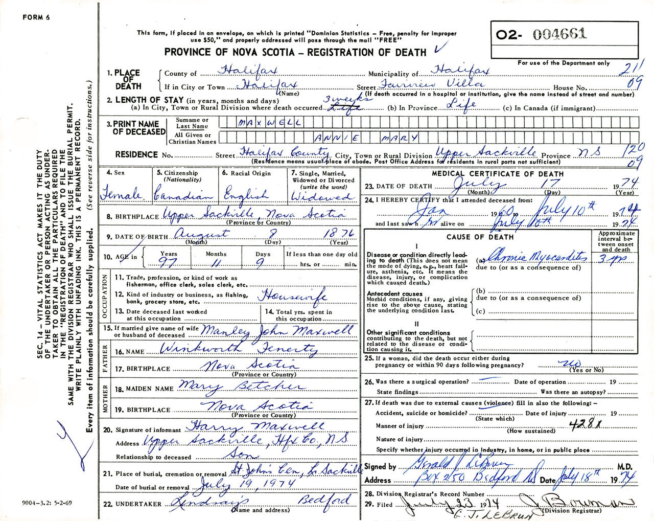 Female Death Registration: Year: 1974 number: 4661