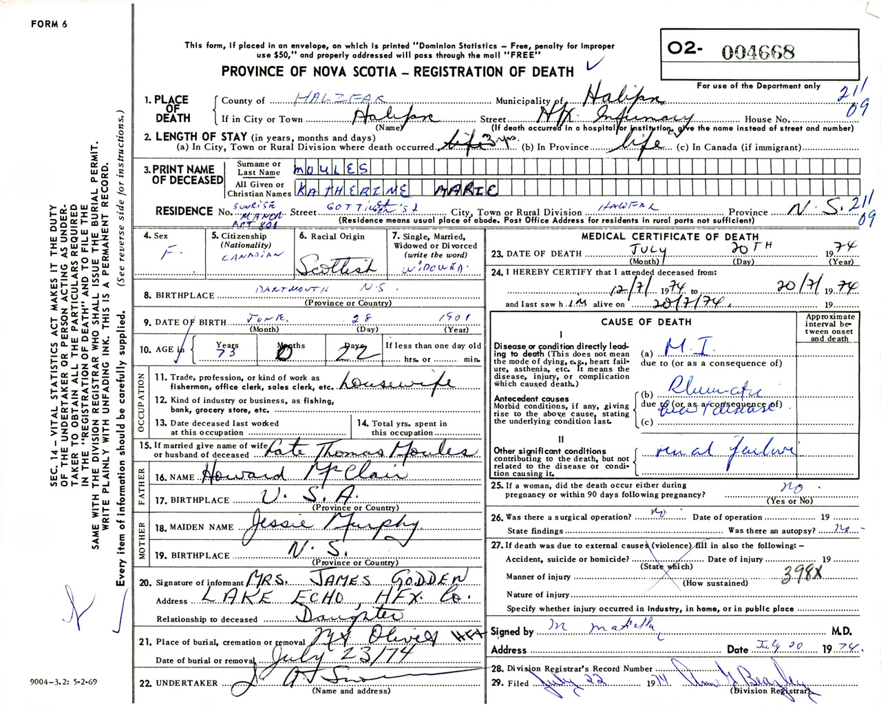 Female Death Registration: Year: 1974 number: 4668