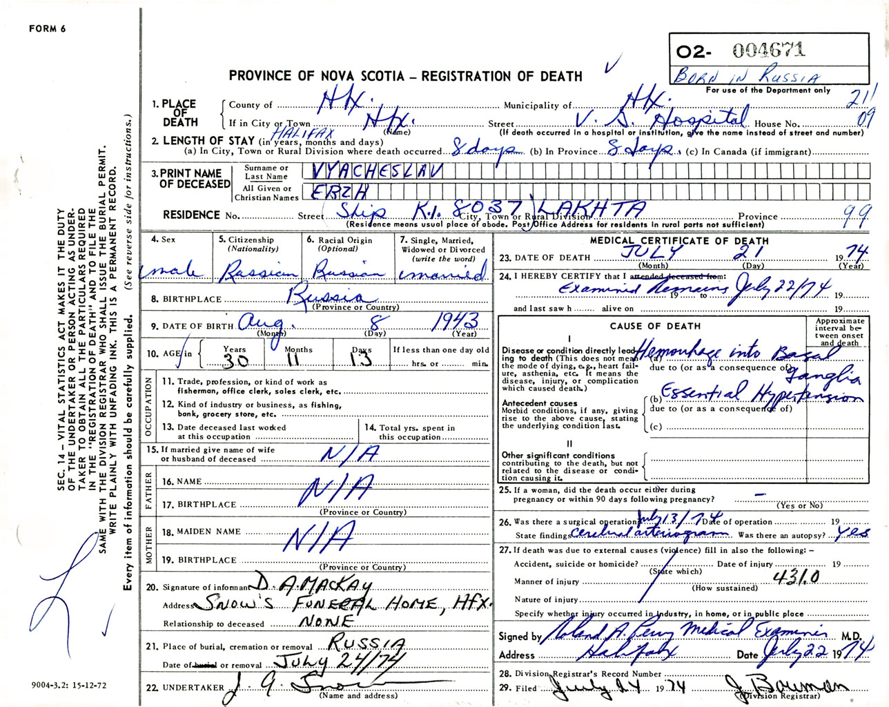 Male Death Registration: Year: 1974 number: 4671