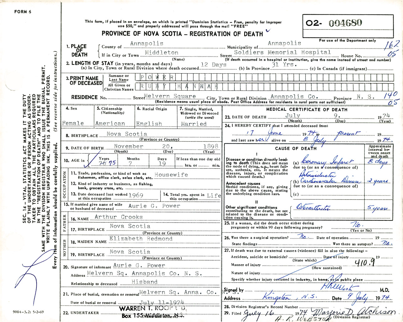 Female Death Registration: Year: 1974 number: 4680